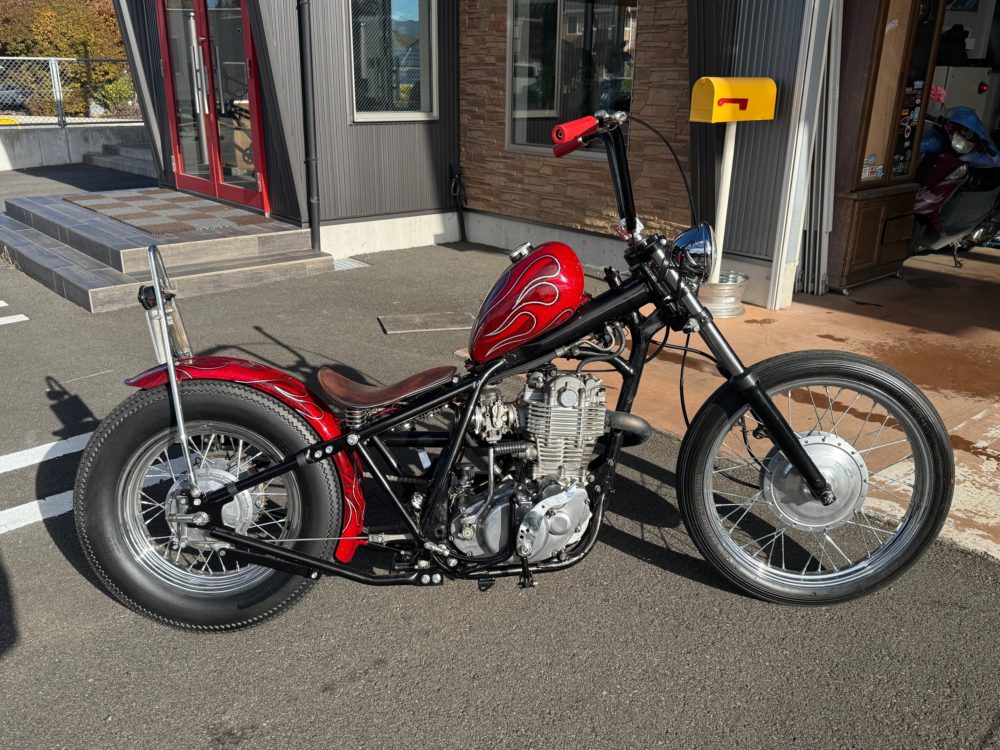 当店ではバイクのカスタムにも幅広く対応しており、今回はヤマハ SR400 をベースに、写真のようなクラシックボバー/チョッパースタイルへと大幅なカスタムを施しました。シンプルながら存在感のあるフレームラインを活かしつつ、街中でも映える個性的なスタイルへ仕上げています。