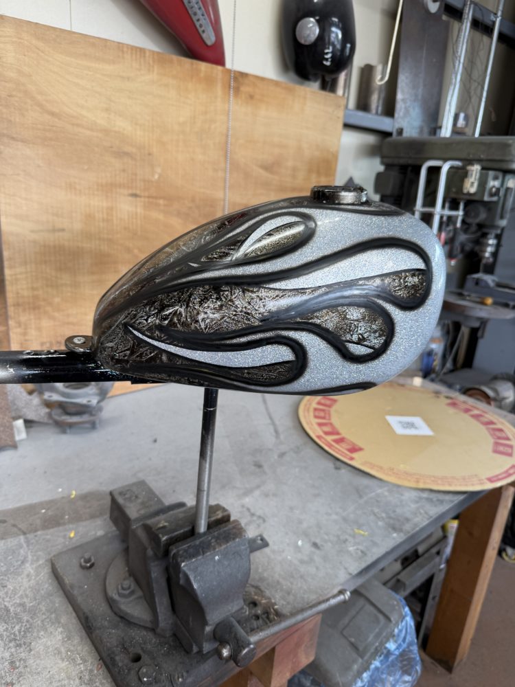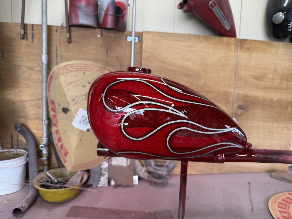 まず目を引くのは、深いレッドにシルバーのフレイム(炎柄)を施したタンクとリアフェンダー。手作業によるペイントで、クラシックかつアメリカンテイストを強く打ち出しています。フレームはブラックで統一し、タンクの鮮やかなカラーとの対比により、車体全体が引き締まった印象に。ハンドルはアップハンドルに交換し、グリップもレッドで統一。操作性とデザイン性を両立しています。